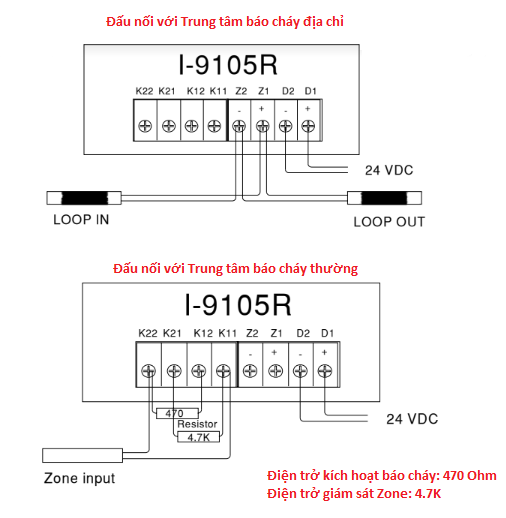 Terminal "Z1, Z2" là đường tín hiệu Loop, kết nối đến đường tín hiệu Loop của Trung tâm báo cháy hoặc thiết bị địa chỉ trước đó