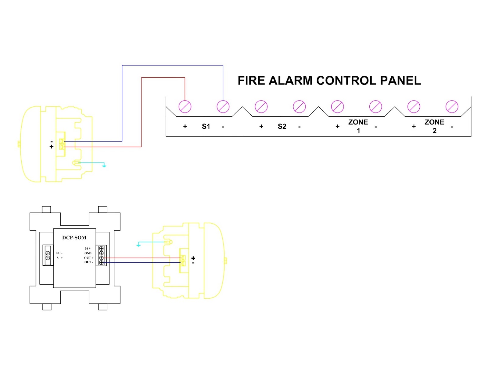 Terminal + (dương) kết nối đến chân S+ (hoặc ngỏ Bell +) Trung tâm báo cháy hoặc Terminal OUT+ của Module điều khiển chuông